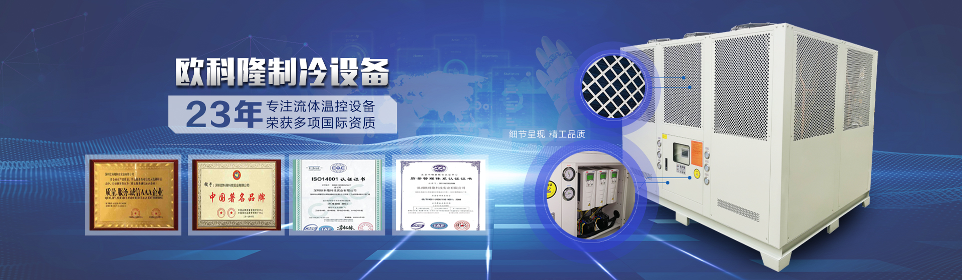 深圳歐科隆科技實業(yè)有限公司源自歐洲先進制冷技術和科學管理模式,承襲歐洲人嚴謹務實、精益求精的工作作風。1963年在洛杉磯成立,1999年在香港設立分部正式進軍亞洲市場,后經(jīng)改革開放招商引資以及日益發(fā)展需求于2006年在深圳成立:深圳歐科隆科技實業(yè)有限公司。半個多世紀以來歷經(jīng)風雨不忘初心、百舸爭流為夢前行一直專注于:工業(yè)制冷設備的研發(fā)、生產(chǎn)制造銷售、服務。經(jīng)營范圍包括:冷水機、螺桿式冷水機組、工業(yè)冷水機、水冷式冷水機、風冷式冷水機組、冷凍機、注塑專用冷水機、電鍍冷水機、混泥土專用冷水機箱式冷水機、低溫型冷水機、耐酸堿冷水機、激光冷水機、中央空調(diào)柜機、電鍍冷水機、化工冷水機、混凝土冷水機、工業(yè)冷凍機、冰水機、非標冷水機、冷卻水塔、模溫機、粉碎機、拌料機等設備及輔助設備。...更多詳情